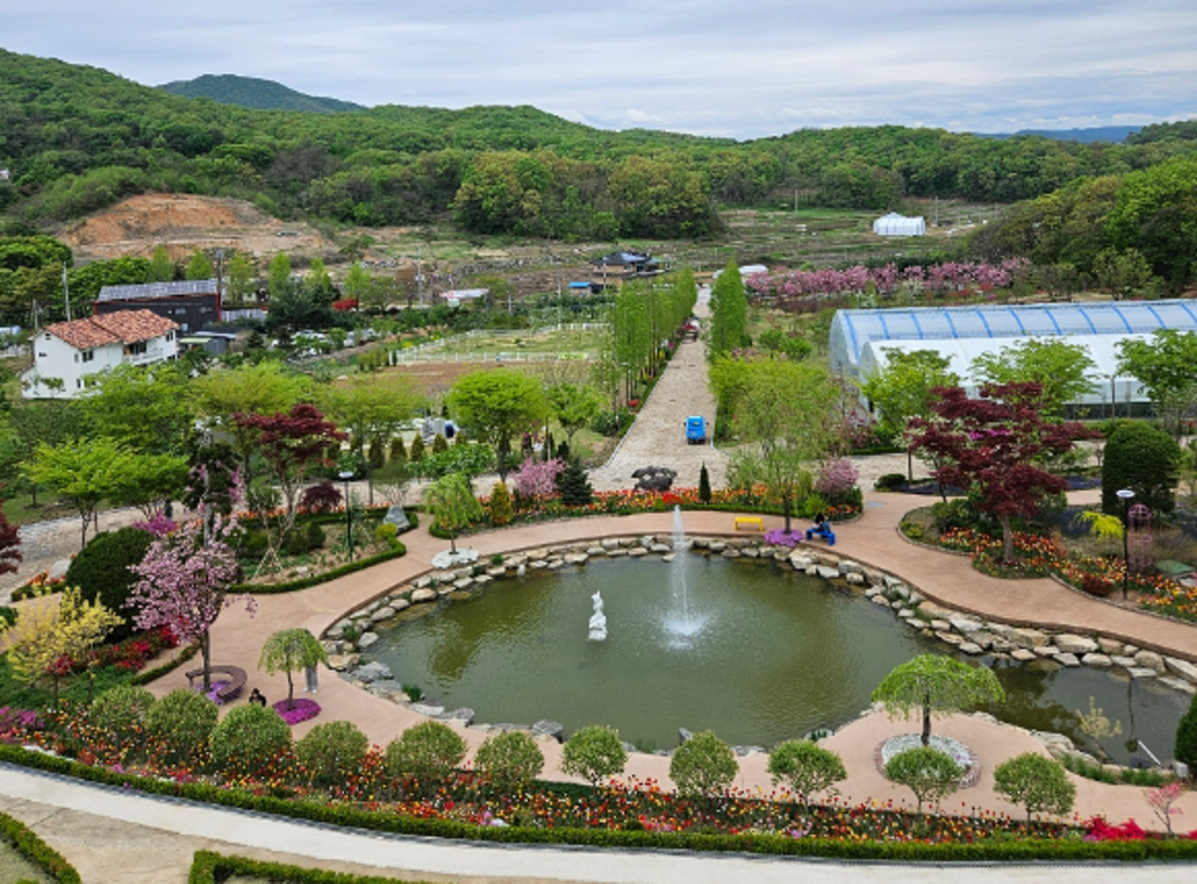 계단 90개 올라가면 자작나무 숲+폭포+정원 조망 가능, 작은 ‘유럽풍 정원’ 느낌의 장소도 있음 - 온실 화원 & 플리마켓존