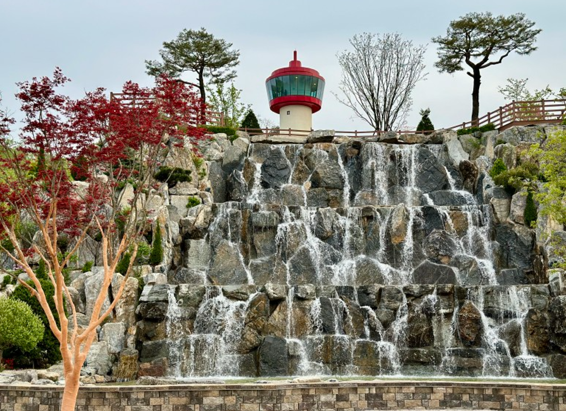 빗방울처럼 물줄기 떨어지는 폭포 아래 벤치에서 사진 촬영 명소로 인기 - 90계단 전망대 오르기
